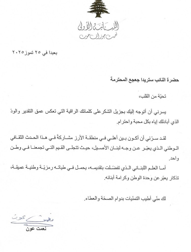 ذات صلة “رجعنا يا لبنان” ورجعت “مهرجانات الارز الد ولية” – ليلة الافتتاح استثنائية ، احتضنت اكبر حشد سياسي ودبلوماسي في لبنان كلمة September 1, 2025 كتاب شكر من السيدة الاولى الى رئيسة لجنة مهرجانات الارز الدولية رسالة شكر September 1, 2025 مهرجانات الأرز الدولية 2025: عودة الفرح والثقافة إلى قلب لبنان افتتاحية September 1, 2025 جمع “رجعنا يا لبنان” ورجعت “مهرجانات الارز الد ولية” – ليلة الافتتاح استثنائية ، احتضنت اكبر حشد سياسي ودبلوماسي في لبنان كلمة September 1, 2025 ليلة 19 تمّوز 2025، احتضنت منطقة الأرز - بشري... اقرأ المزيد كتاب شكر من السيدة الاولى الى رئيسة لجنة مهرجانات الارز الدولية رسالة شكر September 1, 2025 اقرأ المزيد مهرجانات الأرز الدولية 2025: عودة الفرح والثقافة إلى قلب لبنان افتتاحية September 1, 2025 بعد غياب دام خمس سنوات بسبب الأزمات المتلاحقة، عادت... اقرأ المزيد “ريسيتال الآلام” لجنة جبران خليل جبران June 4, 2025 نظّمت لجنة جبران الوطنيّة ـ معهد جبران الموسيقي "ريسيتال... اقرأ المزيد مجلس بلدية بشري يشكر جميع الذين شاركوا في حملة النظافة بلدات June 4, 2025 اقرأ المزيد رسالة شكرمهرجانات الارز الدولية كتاب شكر من السيدة الاولى الى رئيسة لجنة مهرجانات الارز الدولية FacebookTwitterPinterestWhatsApp September 1, 2025 المادة السابقةمهرجانات الأرز الدولية 2025: عودة الفرح والثقافة إلى قلب لبنانالمقالة القادمة“رجعنا يا لبنان” ورجعت “مهرجانات الارز الد ولية” – ليلة الافتتاح استثنائية ، احتضنت اكبر حشد سياسي ودبلوماسي في لبنان